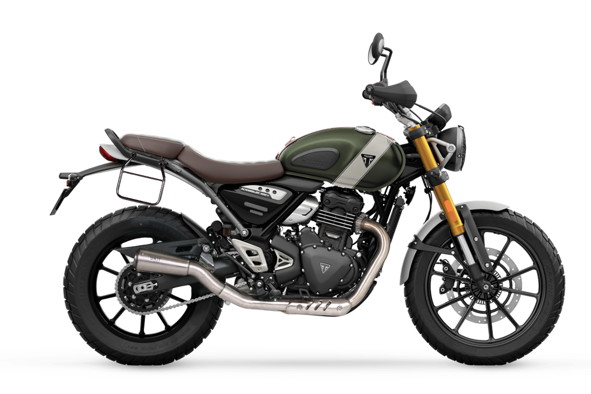 纯色侧包,采用二层牛皮制成 + Triumph Scrambler 400 X DX 车架(仅与我们的低排气代码兼容:4206Low)