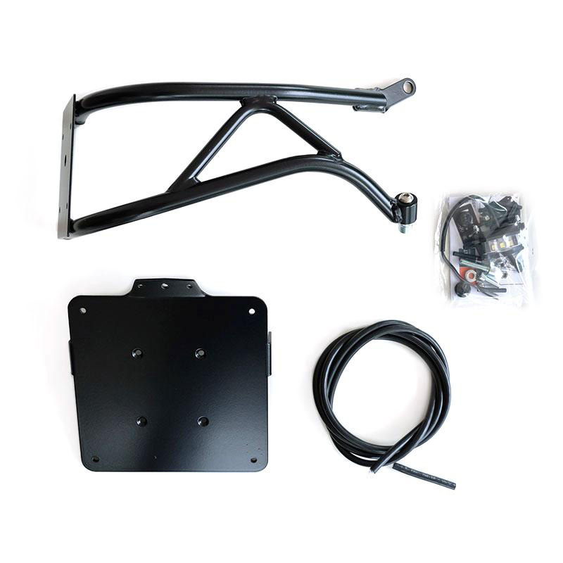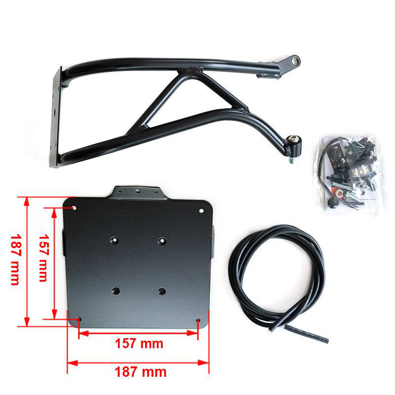 由黑色环氧粉末涂层钢管制成,配有铝制车牌架,带有用于原装或售后箭头的支架(箭头不包括在内,请参阅基本箭头套件 cod 1523)。包括大灯和指示灯的接线延长线,电线在管内穿过。为了固定到万向节,提供了一个特殊的油帽,可以固定车牌架。使您可以显着改变后部自行车的个性和风格。牌照架尺寸:187 x 187 mm