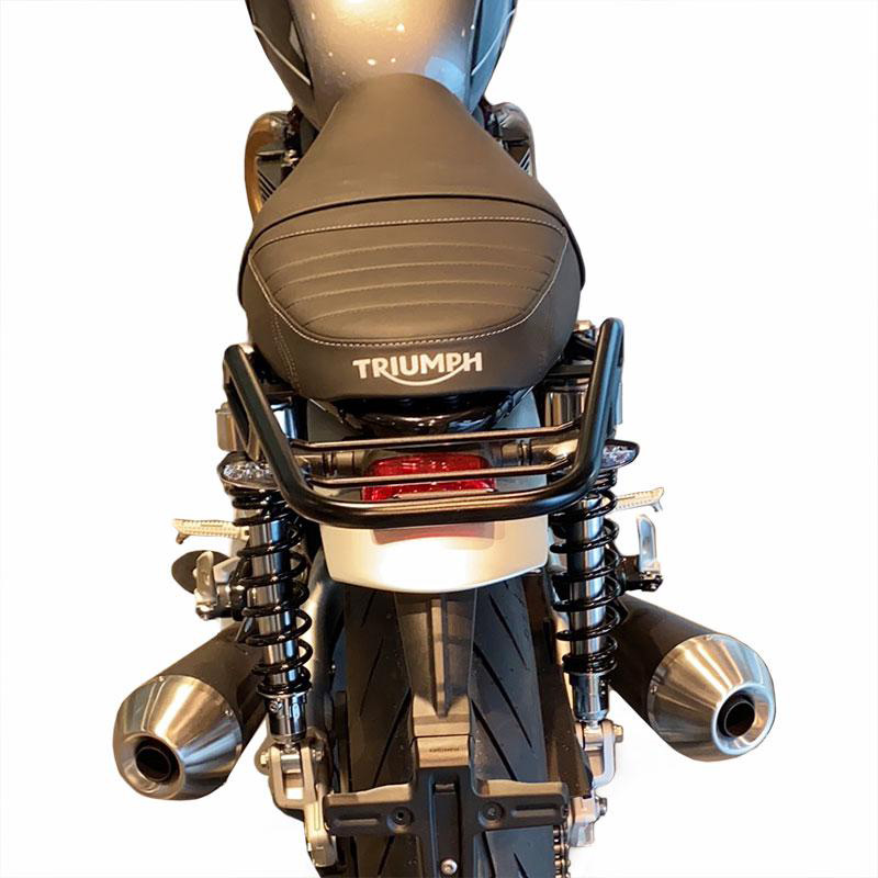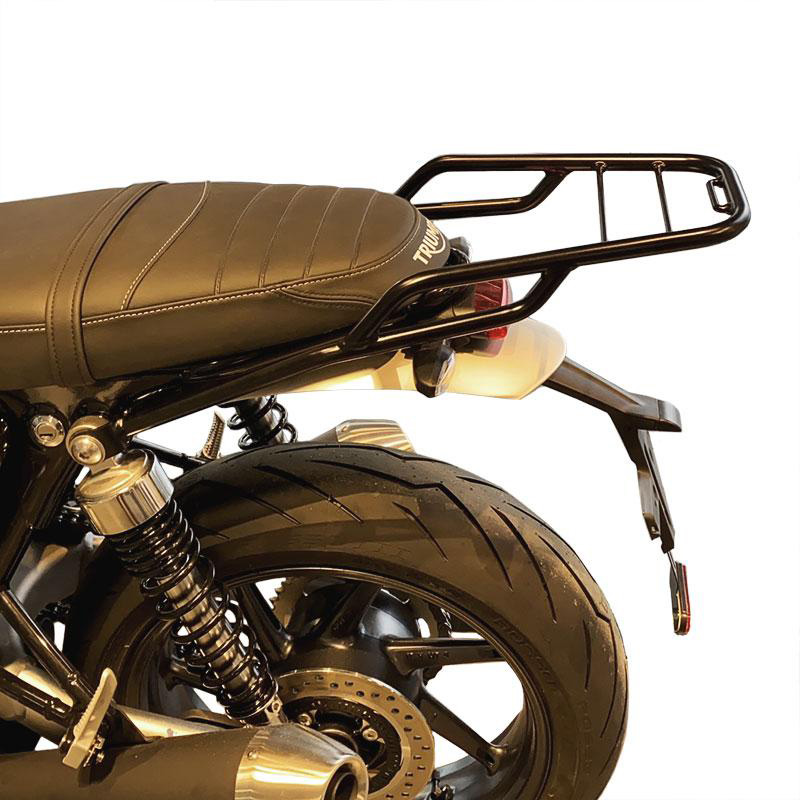 行李架由钢管制成,表面哑光黑色环氧粉末。它完成了后部部分,并配备了乘客把手,通过拆下鞍座可以非常简单地将其固定到车架上。坚固实用,提高了摩托车的美观度。