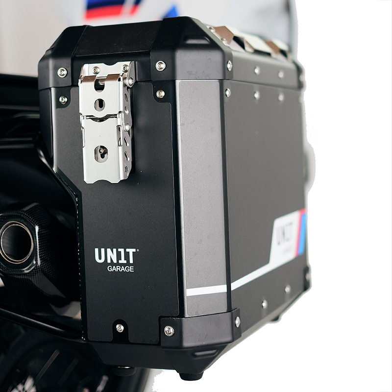 我们想要经典、坚固、优雅的包袋,配有漂亮的钢拉链和周到的细节:为冒险而打造的细节,可承受任何条件。由于包背面设有安全挂钩系统,它们可以固定在任何直径为 18 毫米的圆管框架上。封口会自动加宽,方便从包框上组装和拆卸。内部杠杆采用坚固的高品质铝合金 CNC 加工而成。盖子完全可拆卸,可从两侧打开,内部配有固定装置,并附带松紧带,可用作手套、文件和小物件的支撑。盖子固定器由皮革制成,带有可拆卸的按扣。该锁的设计允许除了所提供的挂锁外,还可容纳额外的挂锁。包身完全衬有坚固的 2.5 毫米氯丁橡胶,可吸收冲击。铰链、锁和所有细节均由不锈钢制成,经过拉丝和电抛光处理,这是您在市场上任何同类产品中都找不到的。角落采用坚固的 ABS 制成,在掉落时可以更换,就像每个单独的组件一样。我们的铝袋完全在意大利制造,并由手工一个接一个地组装。