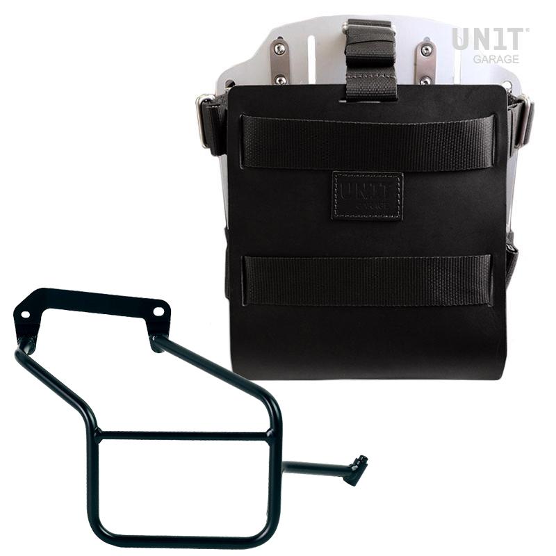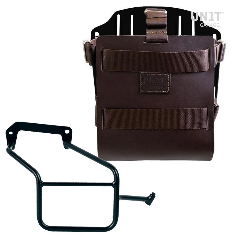 配有用于锁定框架本身的锁。该板在自行车的侧面形成了一个平坦的安装表面,这将允许运输未连接的袋子或其他物体,例如睡袋、夹克等。前翻盖采用 3 毫米皮革饰面,注重最小的细节,可以使用随附的滑块进行调整,并且可以非常快速地从板上取下。