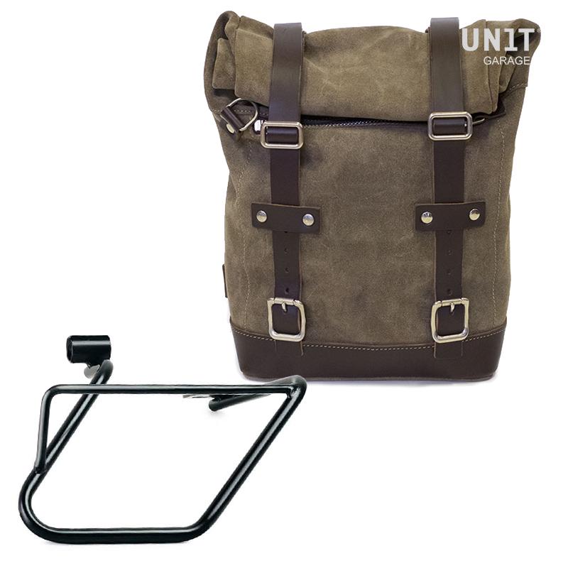 用蜡处理,使其防水。注重最小的细节,采用 3 毫米皮革饰面,简单而纯粹,就像它所用的材料一样。它可以快速连接到我们的包架框架,快速释放系统应用于包的背面,包的背面配有锁定锁。它可以包含一个 15 英寸的笔记本电脑,它配备了一个大的拉链口袋,用于存放电话和文件。
