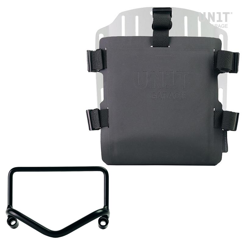 板,带有用于锁定框架本身的锁。该板在自行车的侧面形成了一个平坦的安装表面,这将允许运输未连接的袋子或其他物体,例如睡袋、夹克等。前翻盖注重最小的细节,采用 Hypalon 饰面,可以使用提供的滑块进行调整,并且可以非常快速地从板上取下。