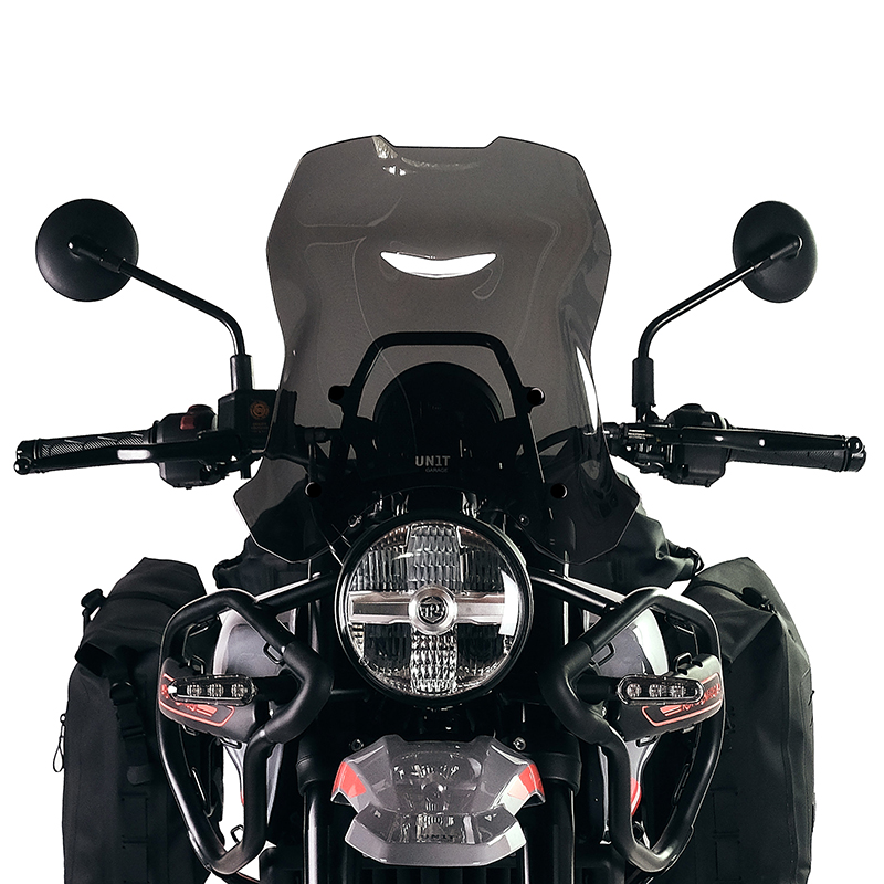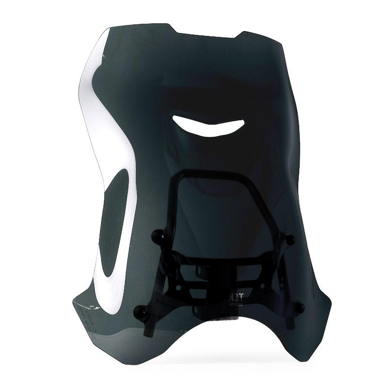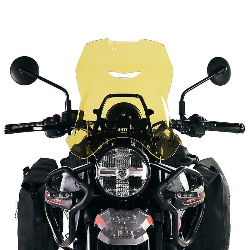 在这个更大的版本中,我们进一步提升了空气动力学保护性能。它配有全新的支架和硬件,与车头完美契合。它由4毫米厚的PMMA(亚克力)制成,安装非常方便。前部通风口可消除湍流,支撑管也可用作GPS或手机支架。