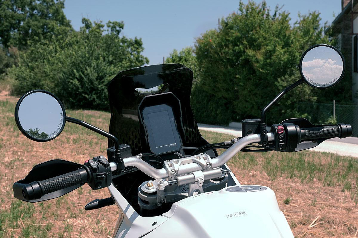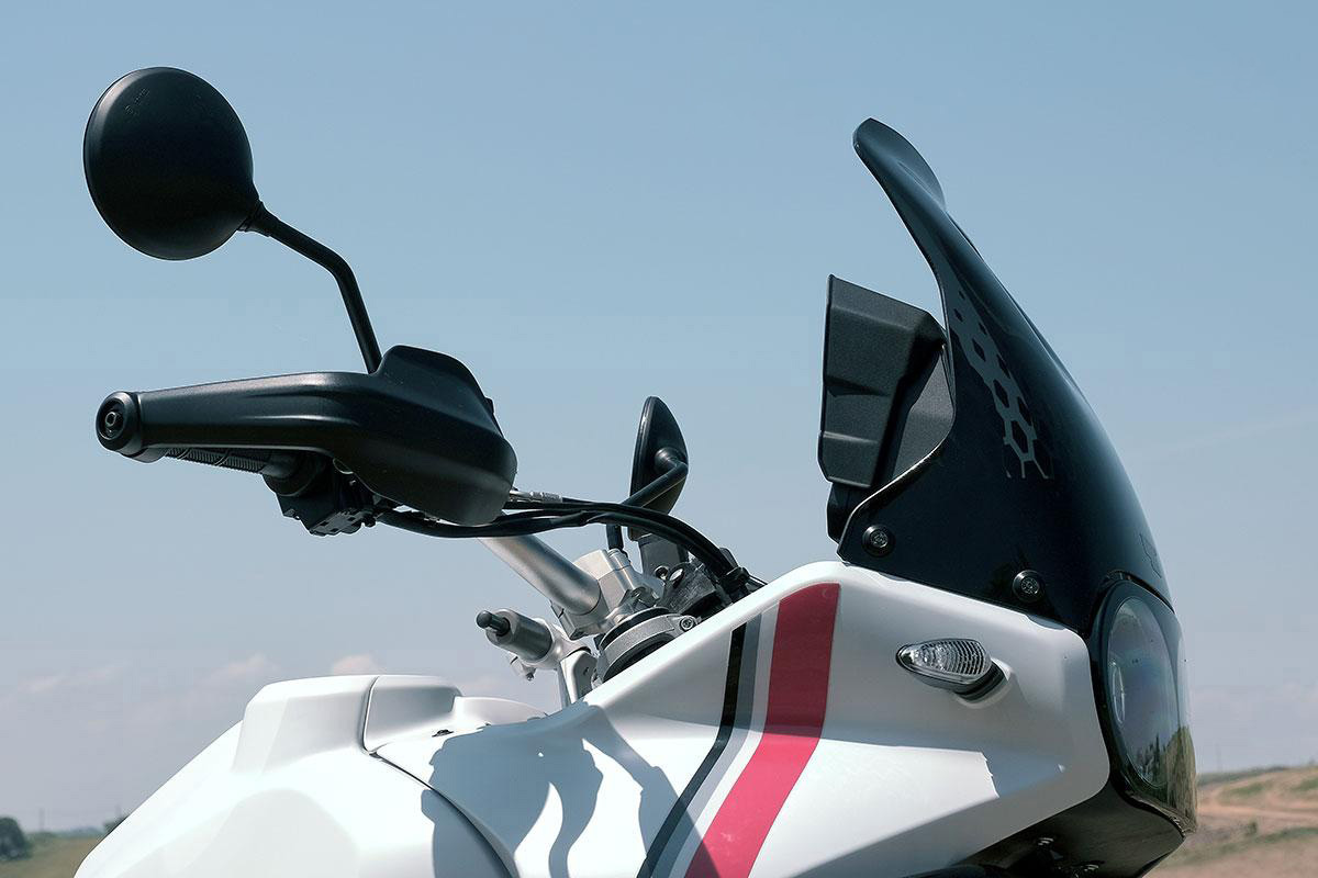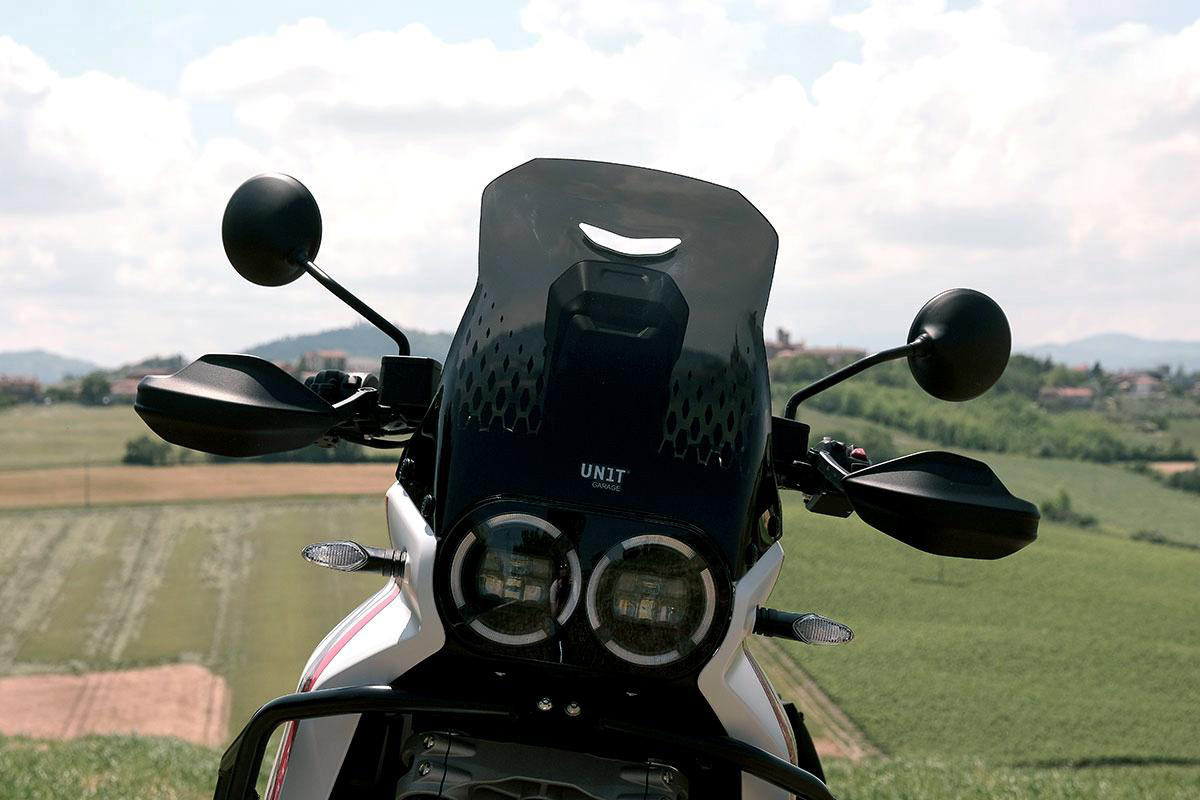 DesertX Edi Sport 整流罩设计为通过重复使用原始支架而无需任何修改即可安装。整流罩的人体工程学设计绝对是个性化的,我们开发了不同的形状、尺寸和透明度,每种都适合不同的高度和期望。在这个版本中,三个提案的平均值,我们保持了与原始版本相似的尺寸,但具有更具保护性的形状,并添加了一个中央进气口,以更受控的方式引导气流。由4mm厚的PMMA制成,有透明和烟色两种,均采用丝网印刷。除了更具保护性之外,它还与自行车的设计完美融合。它配有黑色阳极氧化 ergal 的螺钉和固定插件,必须重复使用原始橡胶。