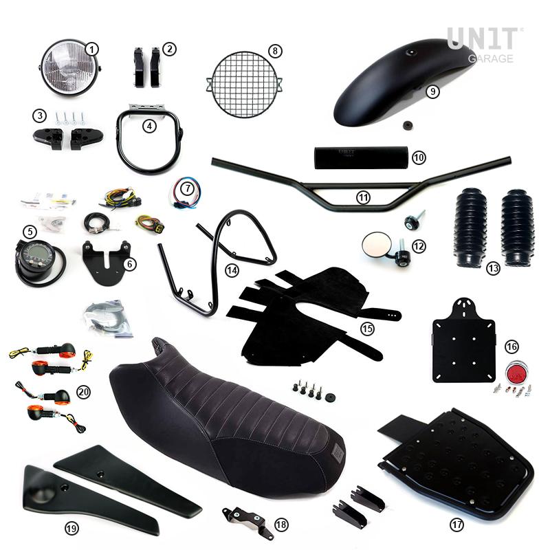 由经过高电阻粉末涂料处理的钢制成。它可以很容易地安装在立管代码:1504 上,并允许安装 BASIC 前灯和可选的 Hubert 整流罩代码:1326。在这个版本中没有对高挡泥板的支持,并且必须移除原始仪器。它设计用于安装代码:1513 的数字仪表支架,作为带有原始转速表和转速表的仪表板的替代品。