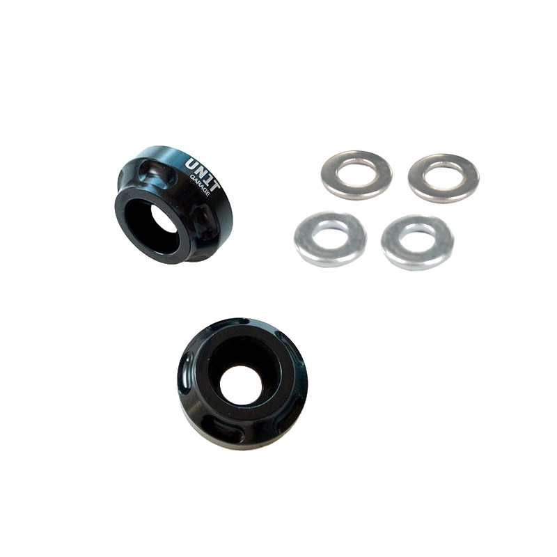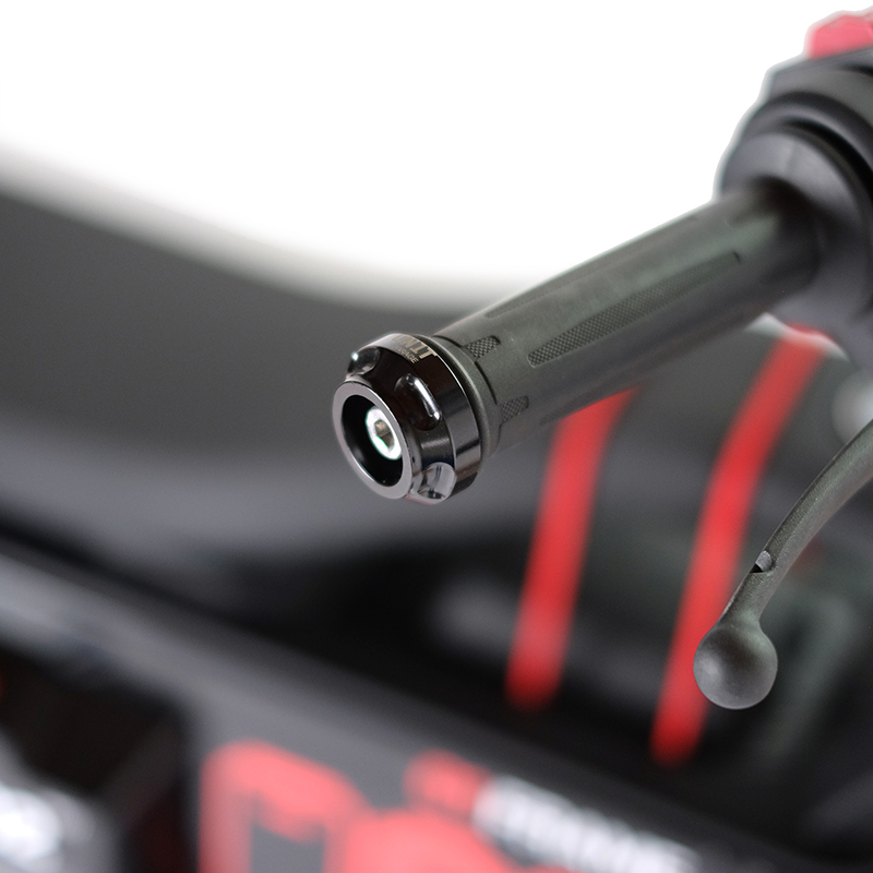 一对 CNC 制造的车把端部具有光滑的黑色表面和单位车库标志,取代了原来的塑料端部。