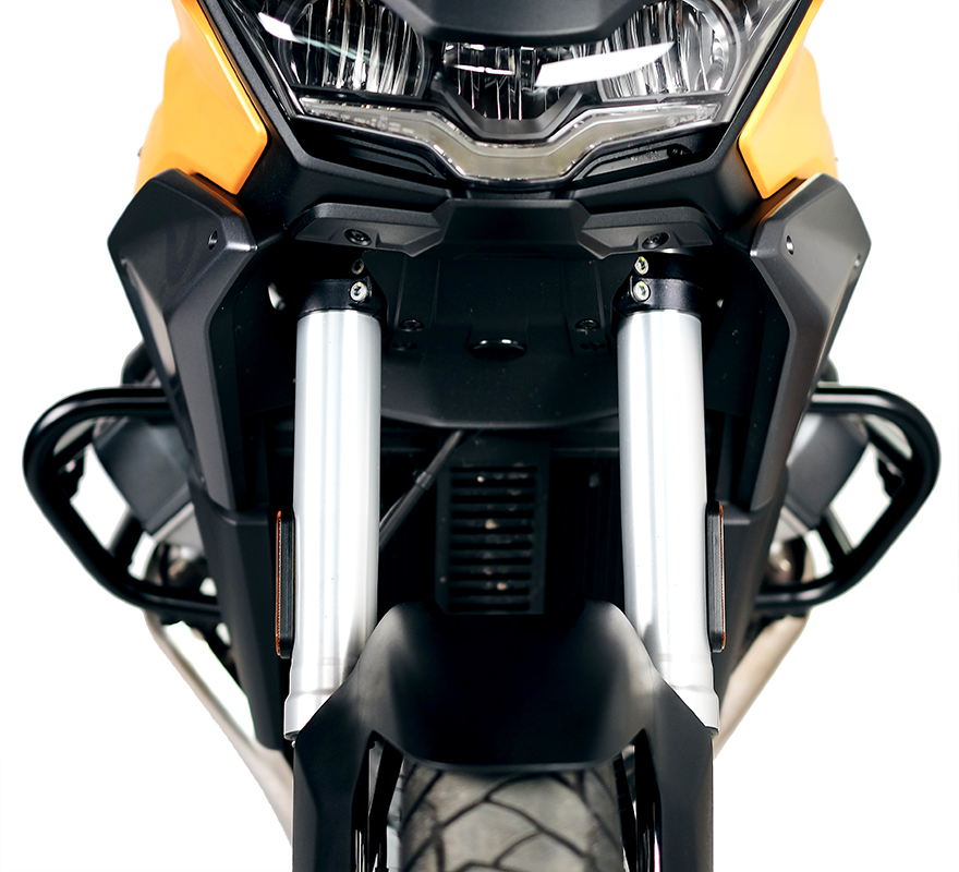 由钢制成,管长 25 毫米,厚度 2 毫米,经过高强度粉末涂料处理。大多数维护工作无需拆除杆即可完成。非常漂亮和优雅,它们完美地勾勒出摩托车的线条。它们配备了您所需的一切,包括组装说明。您还可以在杆上找到用于固定附加前照灯的 M6 螺纹焊接插件