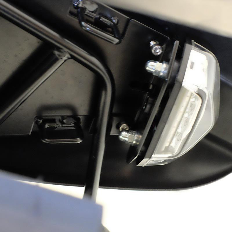 由带有哑光黑色饰面的铝制成,它允许 OEM 大灯安装在框架下方,并消除了所有原始牌照支架。