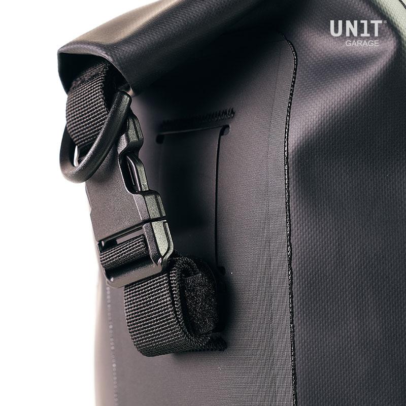 它通过已经包含并安装在袋子背面的快速释放系统Cod.U000迅速连接到我们的袋子固定架上,该系统配有用于锁定框架本身的锁。它可以在内部容纳一个15英寸的笔记本电脑,并配有一个大的防水袋。